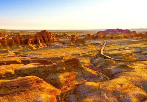 魔鬼城又稱烏爾禾風城。位于新疆維吾爾自治區(qū)準噶爾盆地西北邊緣的佳木河下游烏爾禾礦區(qū),西南距克拉瑪依市100公里。有一處獨特的風蝕地貌,形狀怪異、當?shù)厝嗣晒湃藢⒋顺欠Q為“蘇魯木哈克”。維吾爾人稱為“沙依坦克爾西”,意為魔鬼城。其實,這里是典型的雅丹地貌區(qū)域,“雅丹”是維吾爾語“陡壁的小丘”之意,雅丹地貌以新疆塔里木盆地羅布泊附近的雅丹地區(qū)最為典型而得名,是在干旱、大風環(huán)境下形成的一種風蝕地貌類型。魔鬼城呈西北、東西走向,長寬約在5公里以上,方圓約10平方公里,地面海拔350米左右。據(jù)考察,大約一億多年前的白堊紀時,這里是一個巨大的淡水湖泊,湖岸生長著茂盛的植物,水中棲息繁衍著烏爾禾劍龍、蛇頸龍、恐龍、準噶爾翼龍和其它[1]  遠古動物,這里是一片水族歡聚的“天堂”,后來經(jīng)過兩次大的地殼變動,湖泊變成了間夾著砂巖和泥板巖的陸地瀚海,地質(zhì)學上稱它為“戈壁臺地”。